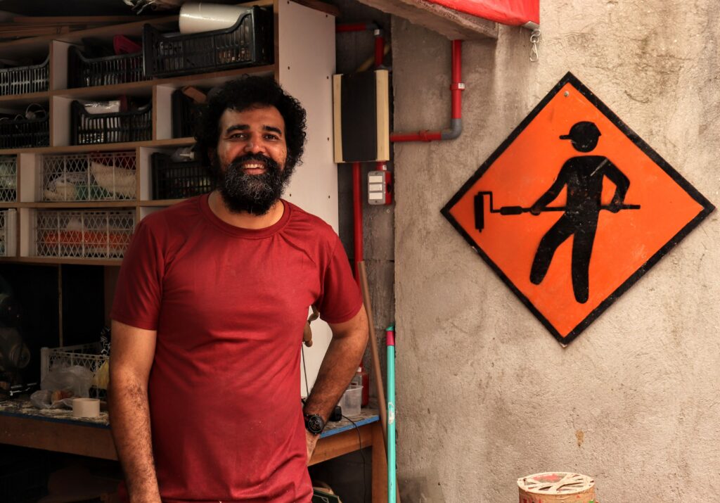 Perê ao lado da placa "Artistas trabalhando" @Nathalia Ract da Silva/Agência Mural