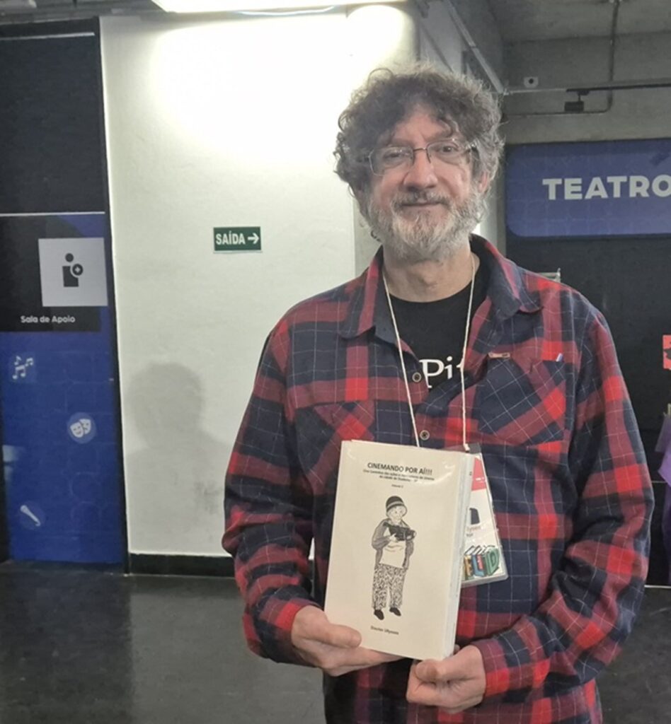 Cineasta Diaulas com o livro “Cinemando por Aí!!!”, lançado no Teatro Clara Nunes @João Vitor Carneiro/Agência Mural