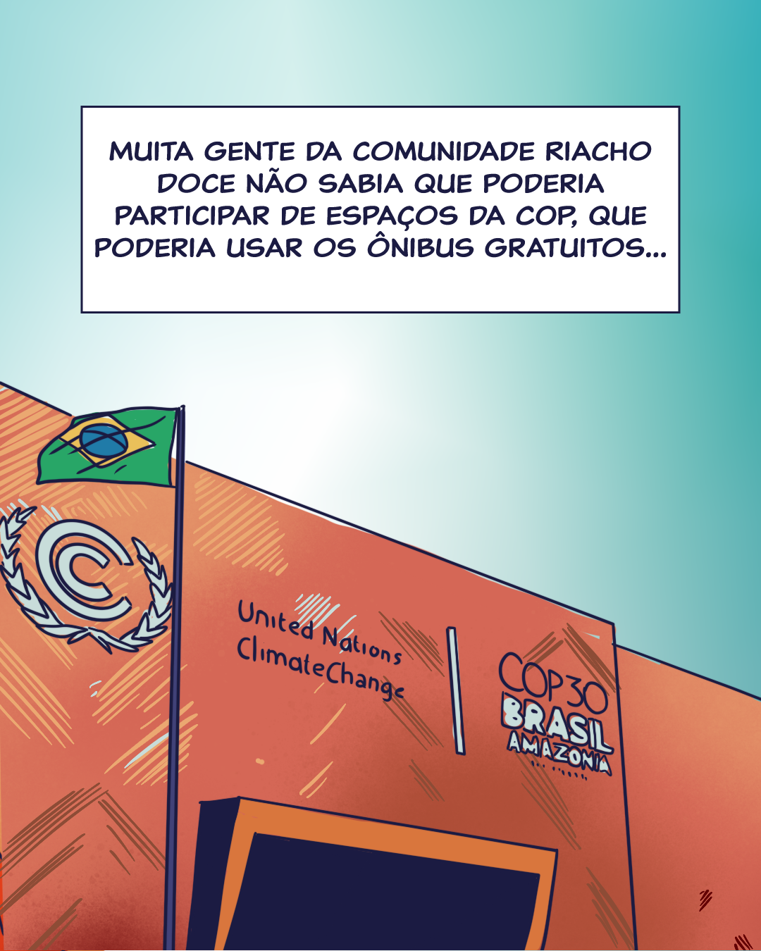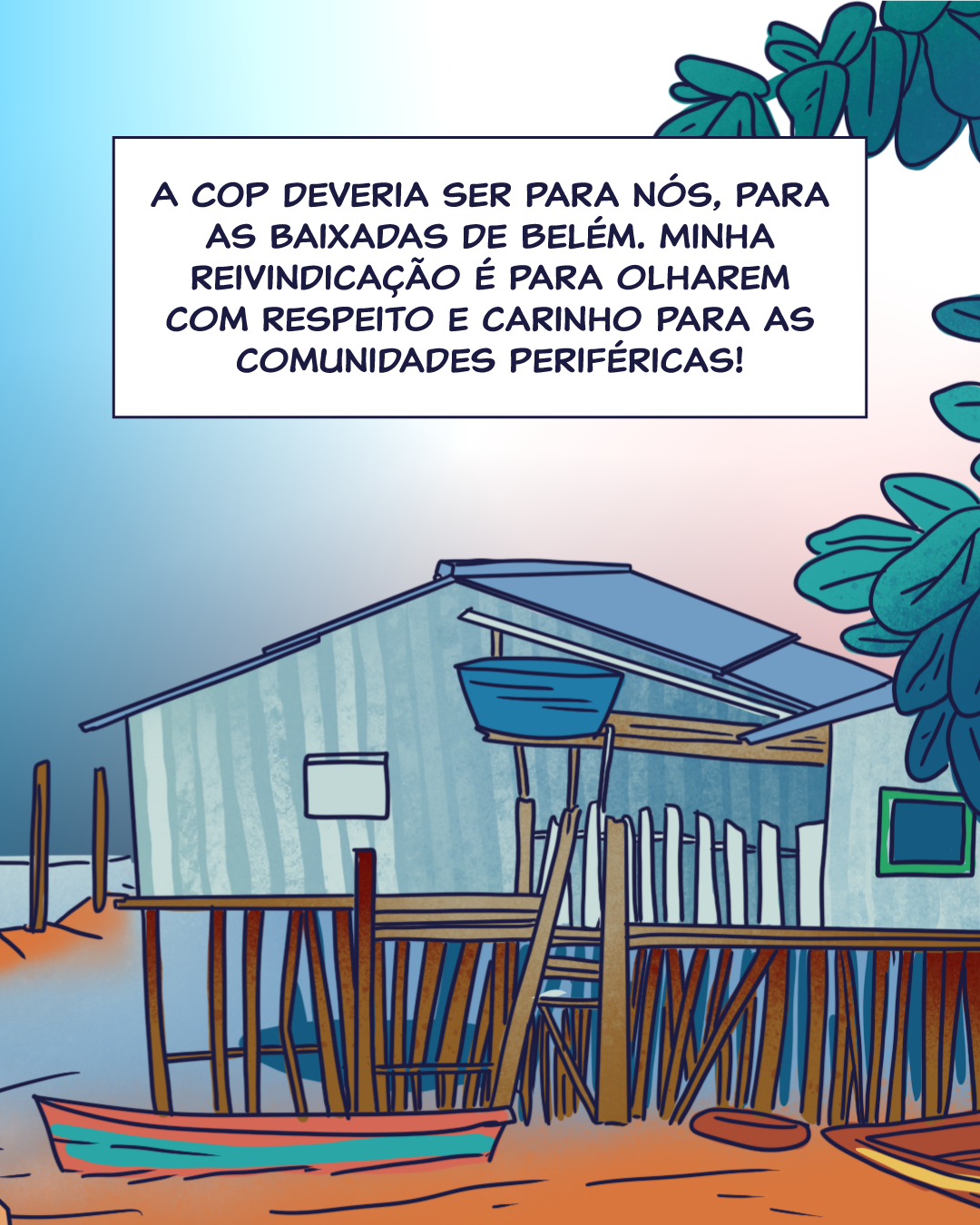Ela lamenta que os jovens periféricos tenham ficado de fora das discussões oficiais da COP30 e, por isso, buscou se inserir e participar de eventos paralelos à COP30, como a Cúpula dos Povos, que ocorreu entre 12 e 16 de novembro na Universidade Federal do Pará (UFPA).