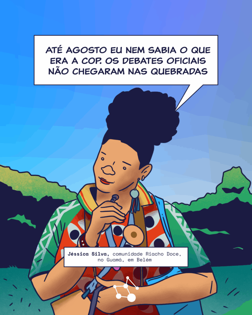 “Até agosto eu não sabia direito o que era a COP. Gostaria de ter participado mais, porém os debates oficiais não chegaram nas periferias”, diz a artista e ativista social Jéssica Silva, moradora da comunidade Riacho Doce, no bairro do Guamá, em Belém. O local é a mais populosa baixada da cidade – seguindo a forma tradicional paraense de se referir às quebradas.