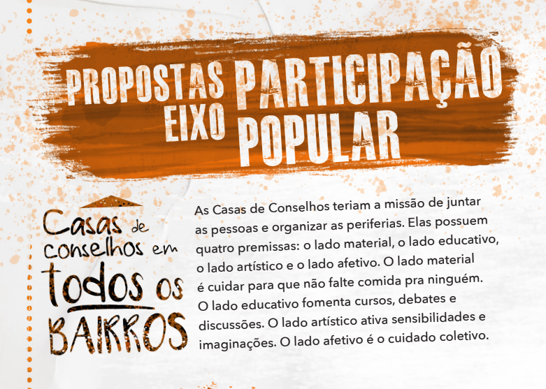 Criar as Casas de Conselhos para organizar as periferias, integrando aspectos materiais, educativos, artísticos e afetivos