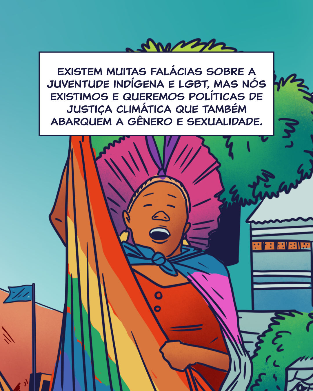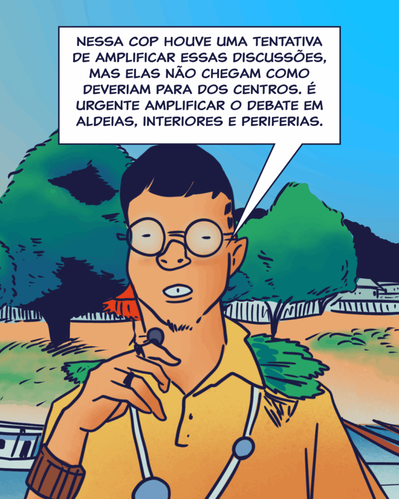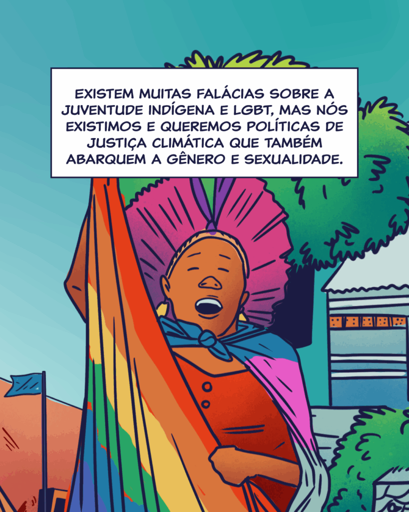 “Esse espaço é fundamental para as juventudes e é importante que estejamos nele trazendo nossas demandas”, diz. “Estamos aqui reforçando que temos a necessidade de políticas publicas especificas para a nossa população. Precisamos de políticas de adaptação e mitigação climática que cheguem aos nossos territórios e consigam abarcar nossa percepção de gênero, sexualidade e a nossa cultura”.